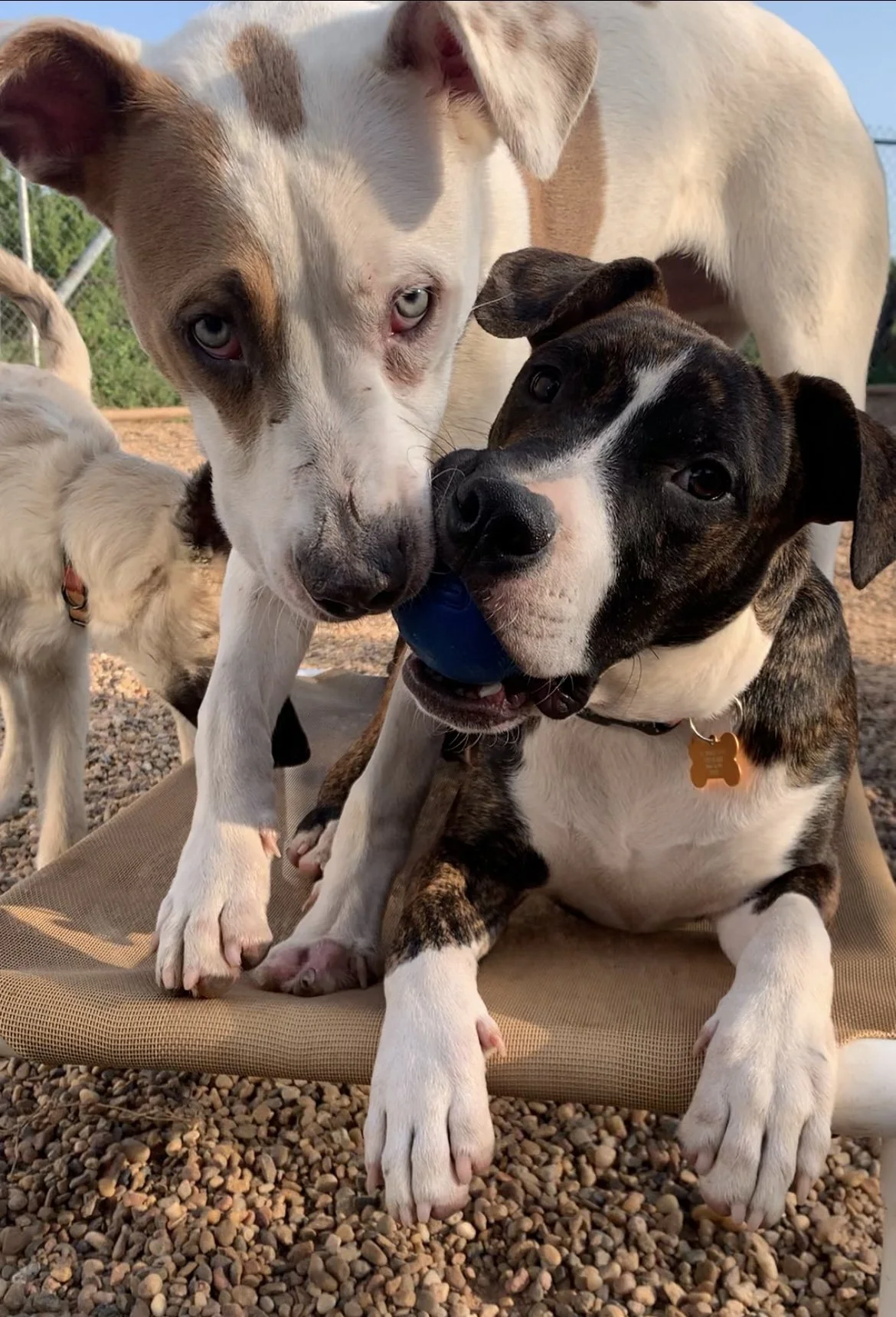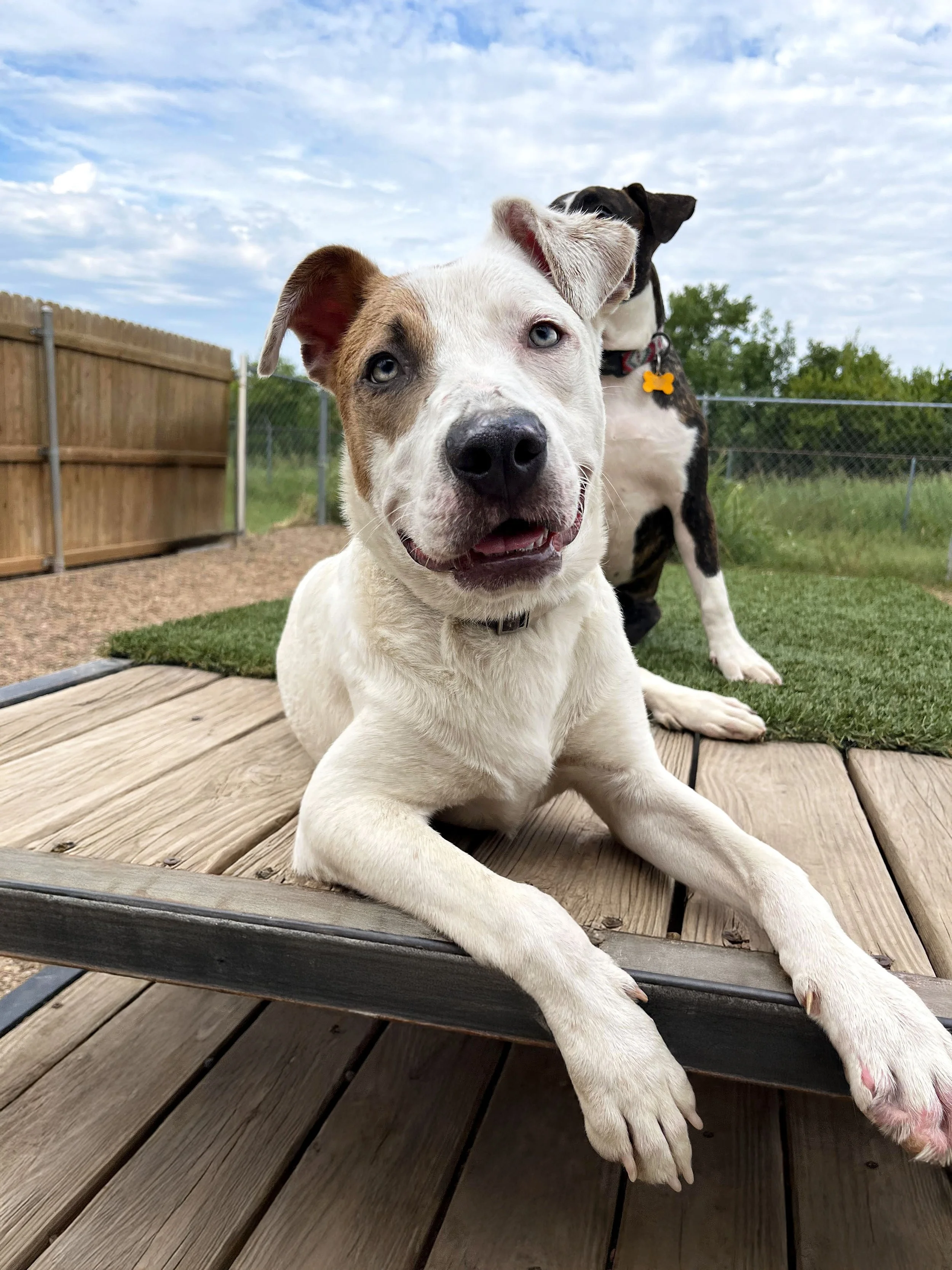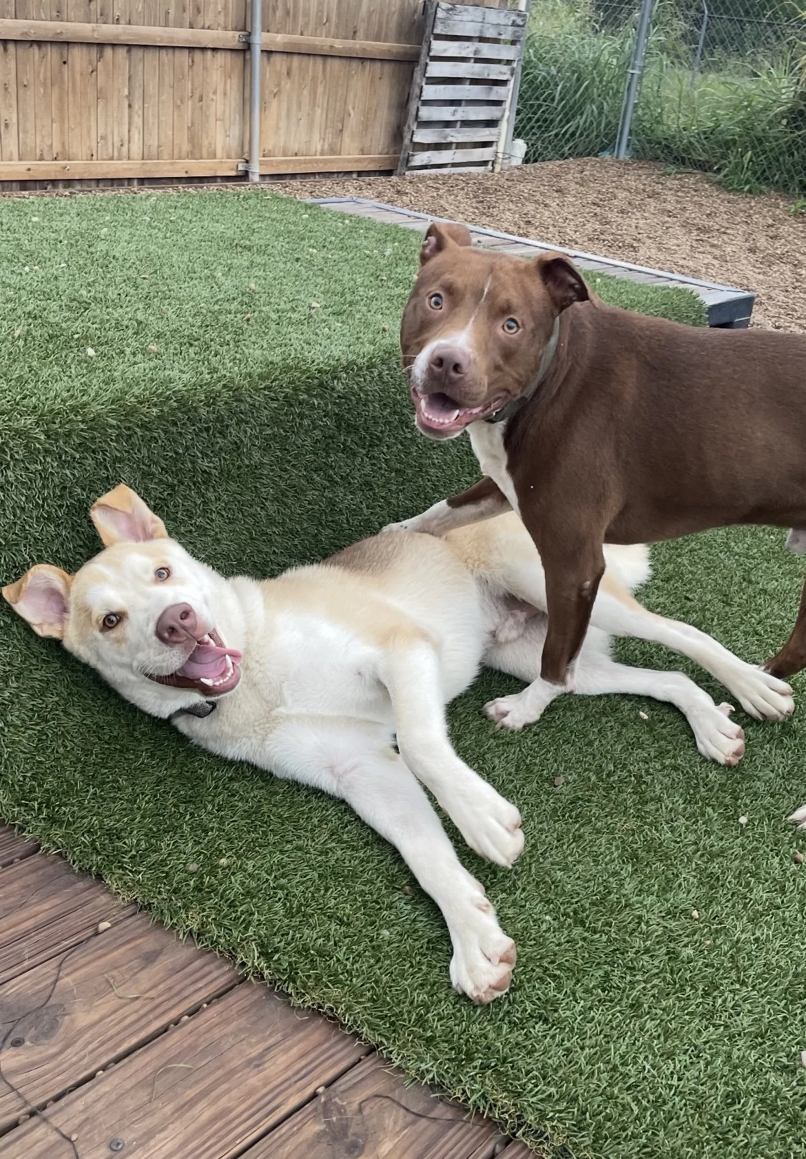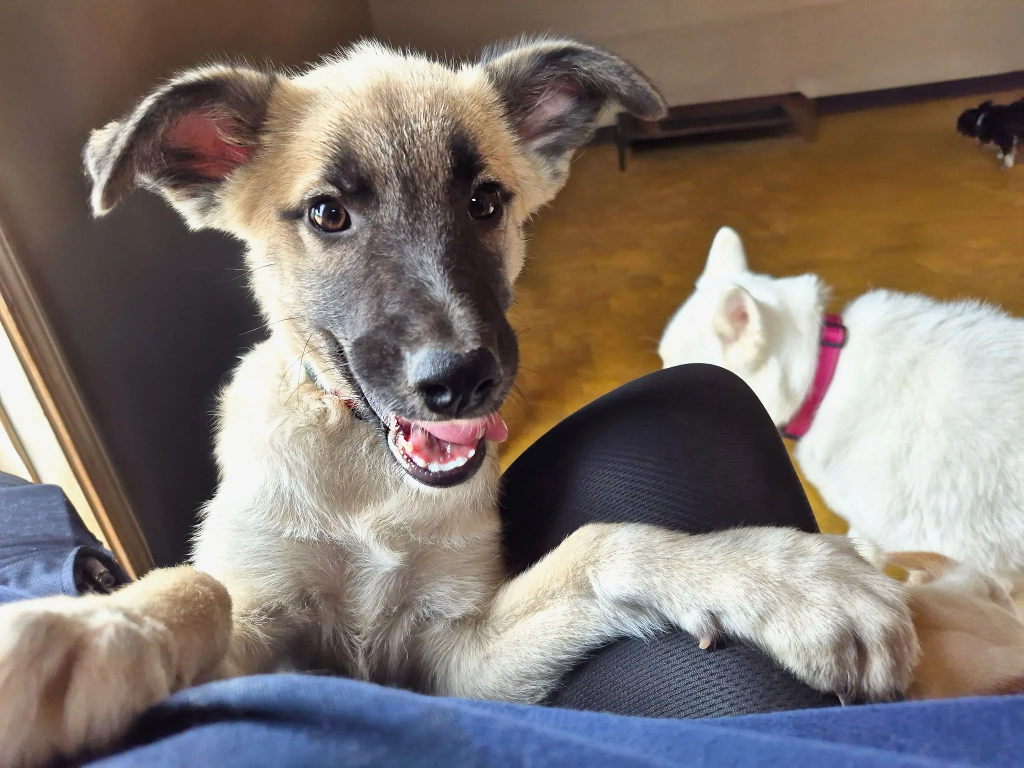 Wolf is an approximately 1 year old male Husky/Shepherd mix, weighing about 60 pounds. His one request is that he can watch his favorite shows like Bluey and Lady & the Tramp! He is very affectionate, super smart, and loves to play! (tan & white dog)